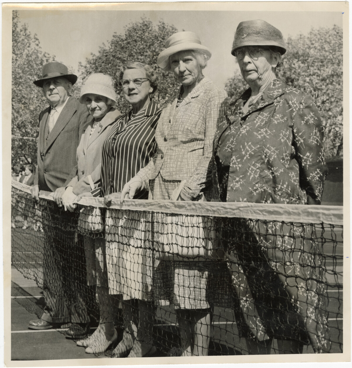 B.T. Turner, Mrs Turner, M.G. Thomson, T. Hannibal, and M. Clark at the Woolston Tennis Club fiftieth anniversary.
