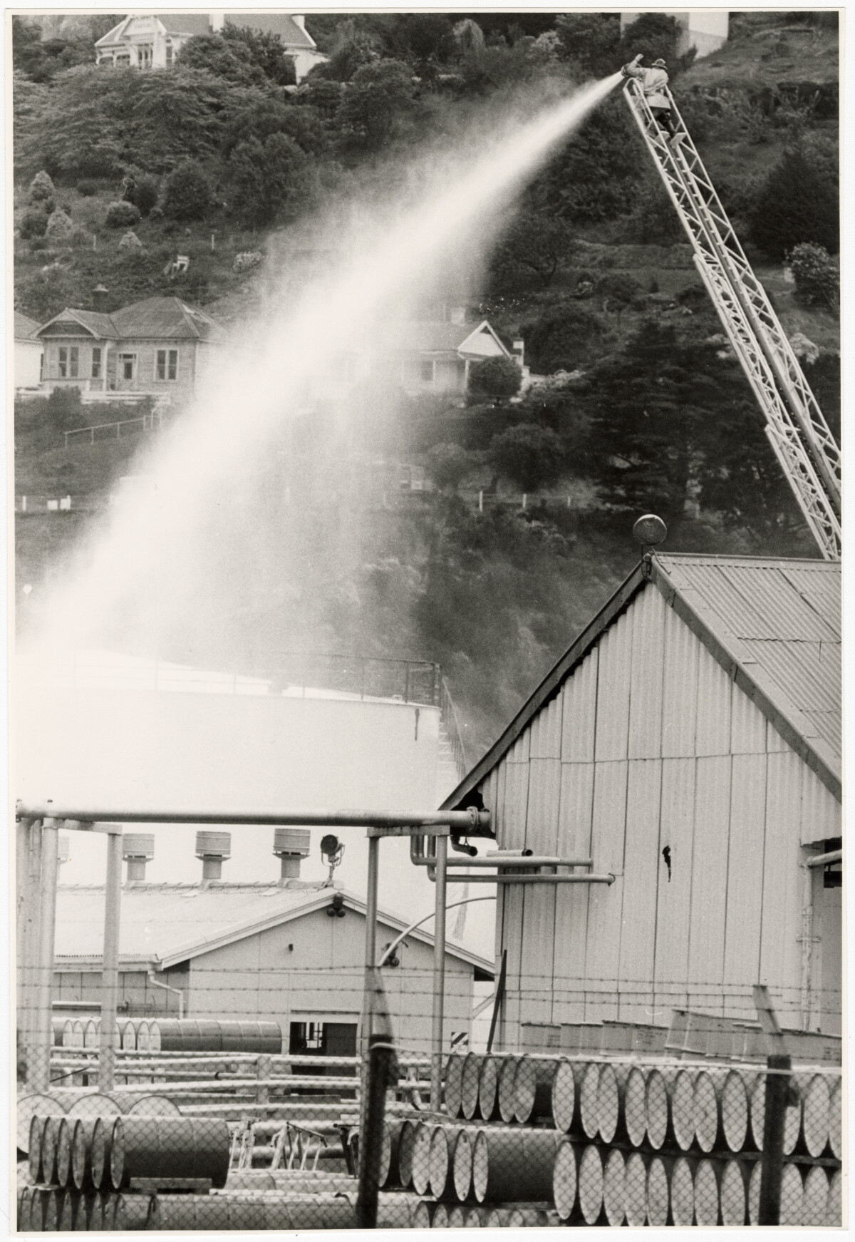 A fire fighter spraying a hose from atop a ladder onto tanks at Lyttelton.