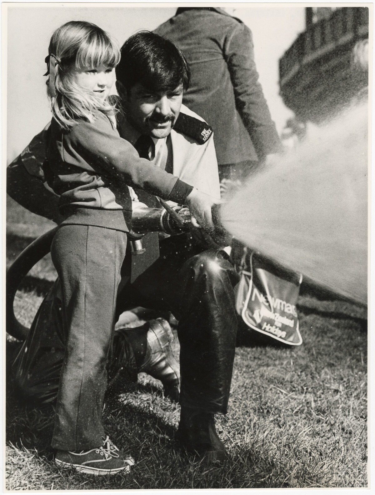 Rochelle Evans tries out a firefighter's hose with assistance from Steve Foster at "Have a Go" Day held at Queen Elizabeth II Park.