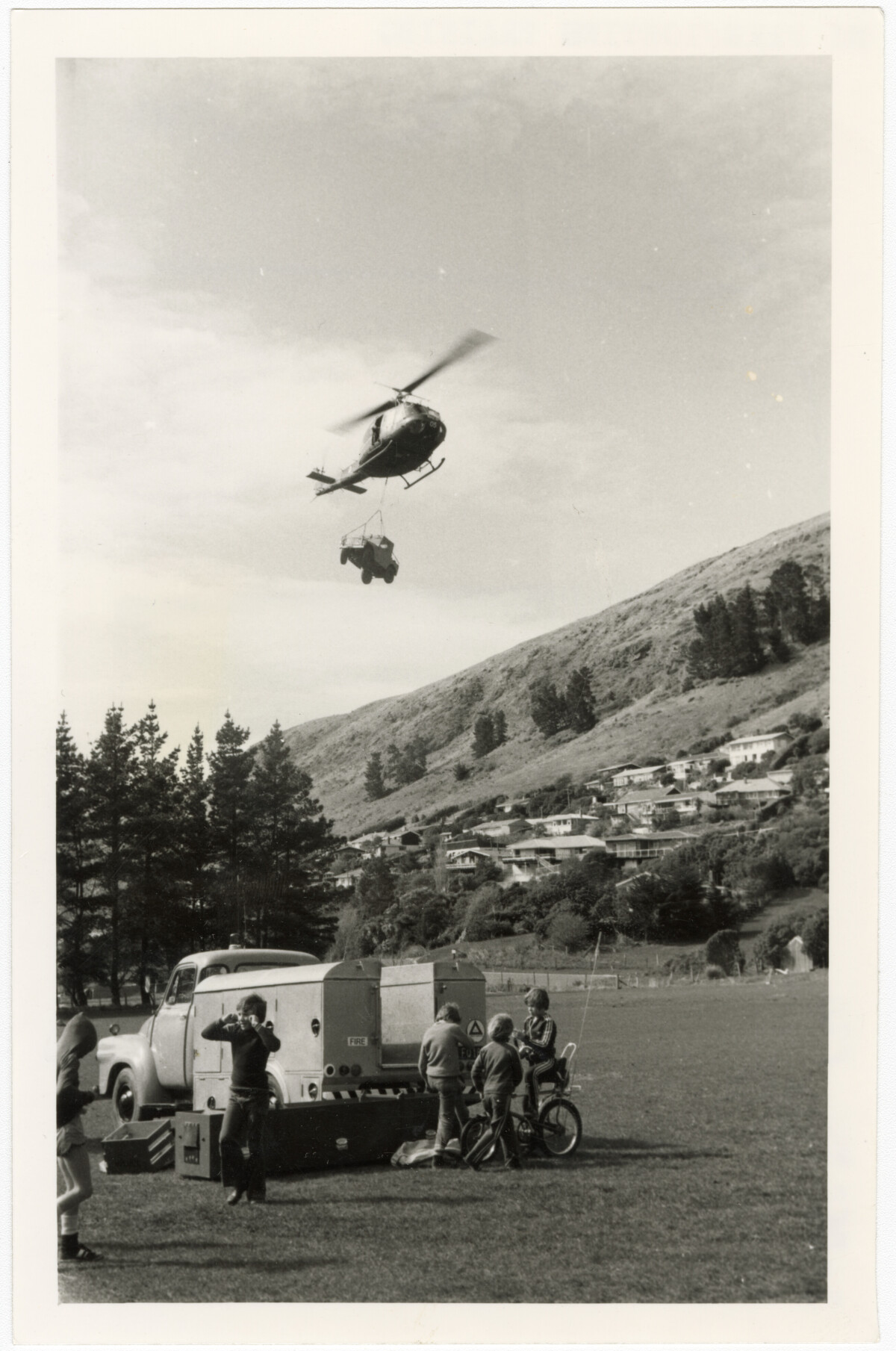 A Suzuki truck being carried by an Iroquois helicopter at Sumner.
