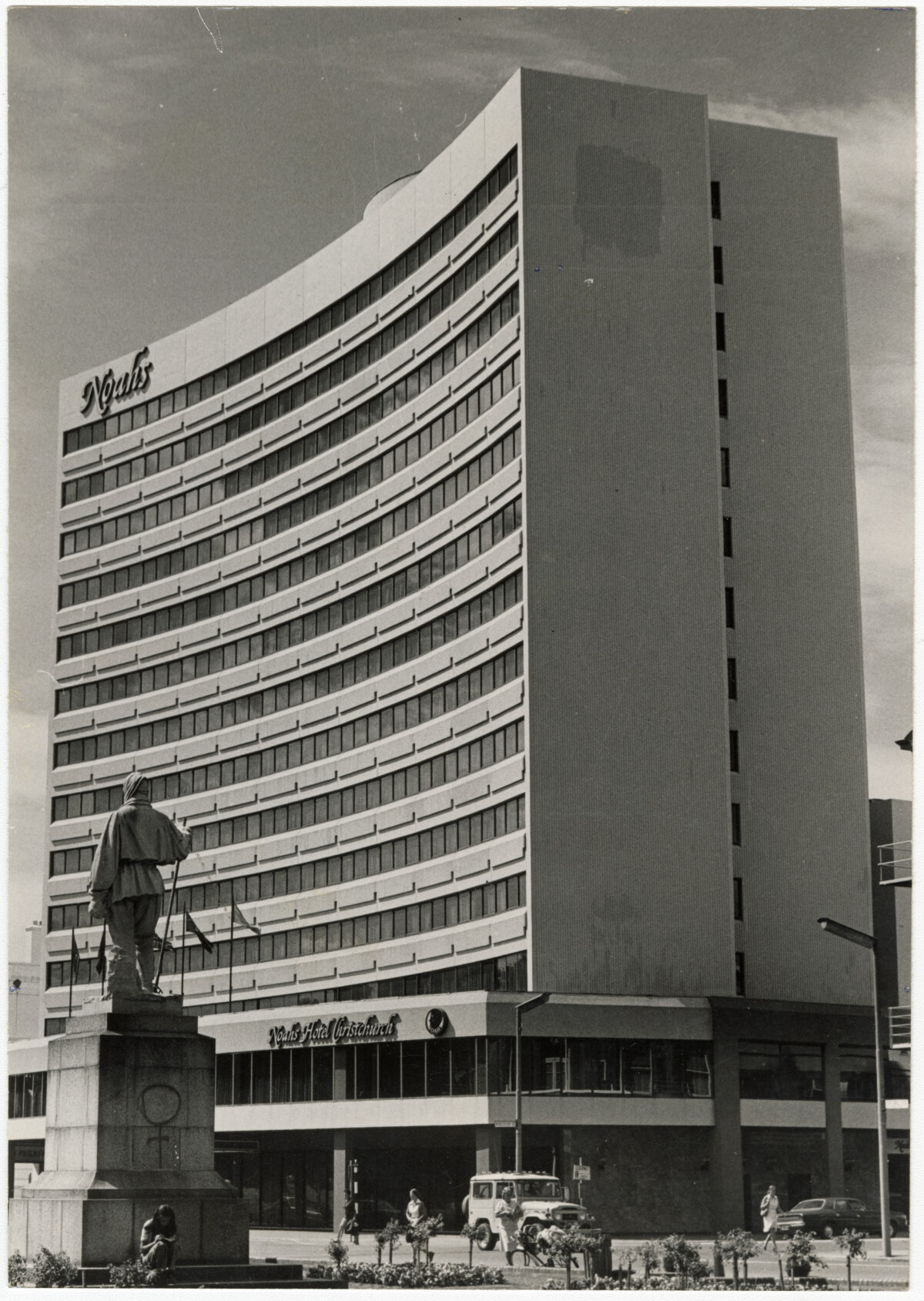 Noahs Hotel on Oxford Terrace, seen at the intersection with Worcester Street. In the foreground is the statue of Captain Robert Falcon Scott.