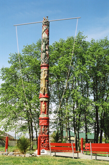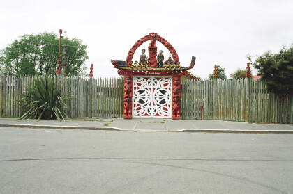 Carved lintel and stockade at the gateway entrance to Nga Hau e ...
