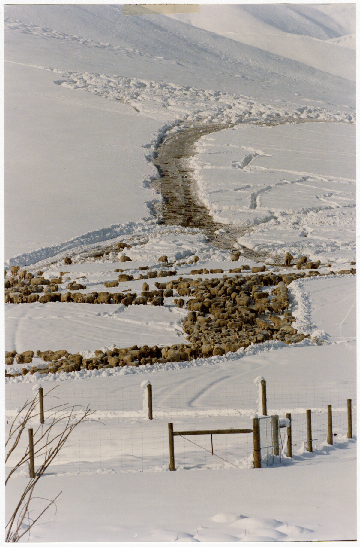 A route ploughed through the snow helps sheep reach lower ground near Burkes Pass.