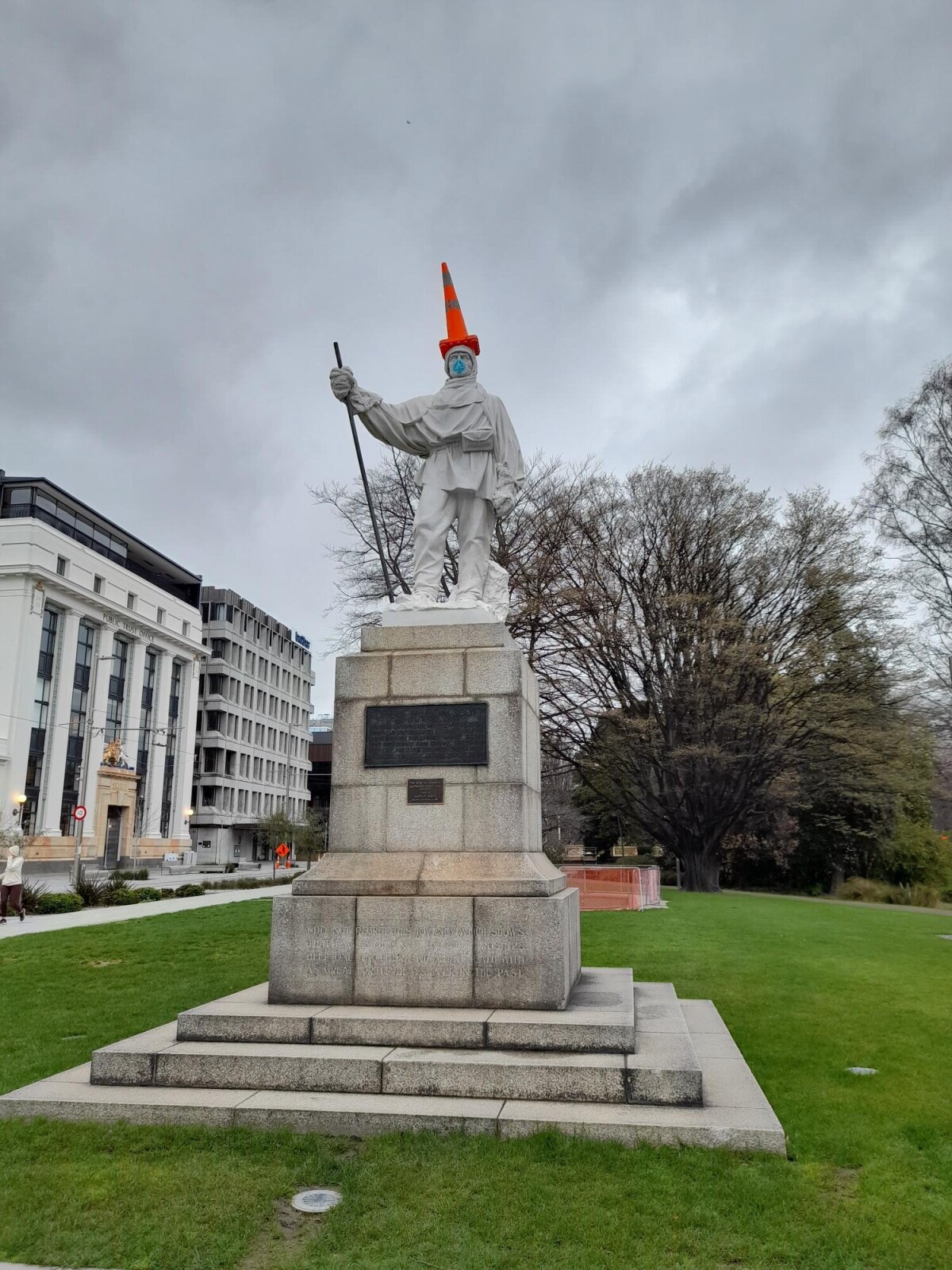 The statue of Robert Falcon Scott that has been dressed in a face mask and had a road cone placed on its head. Taken during the COVID level 4 lockdown of 2021.