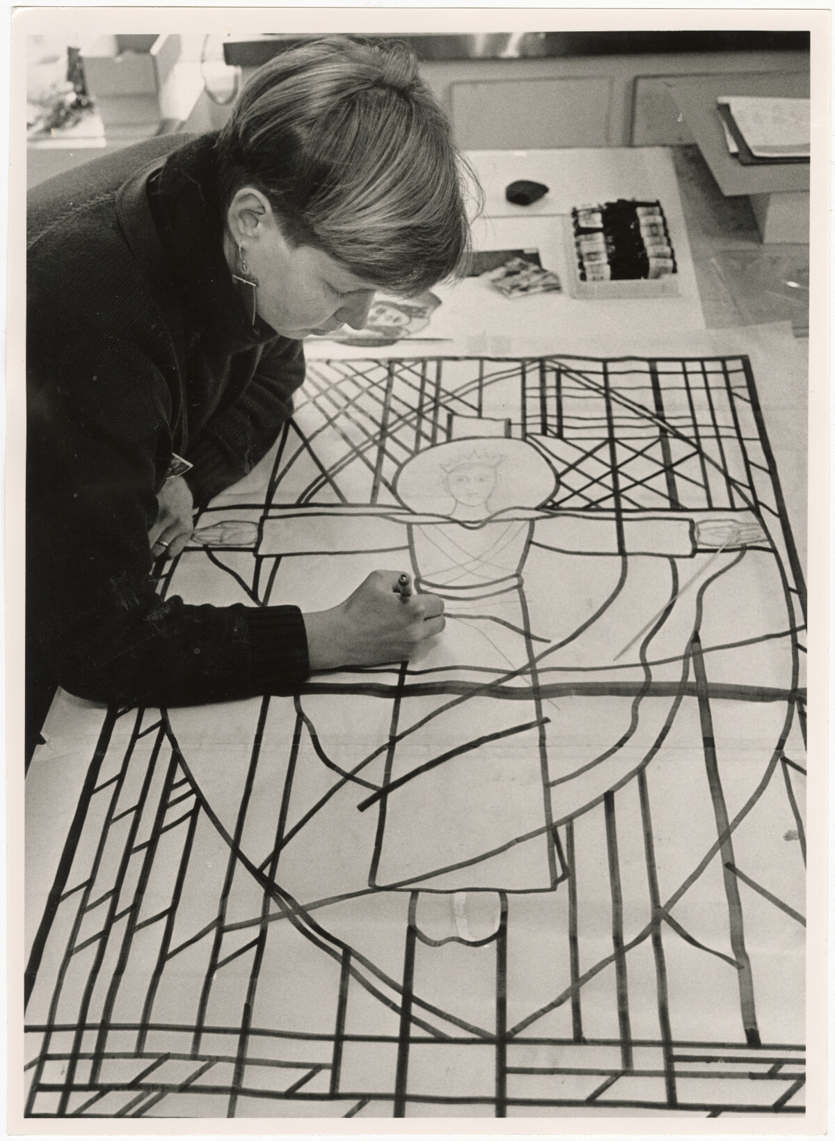 Rena Jarosewitch with a pattern for a stained glass window comissioned for a country church.