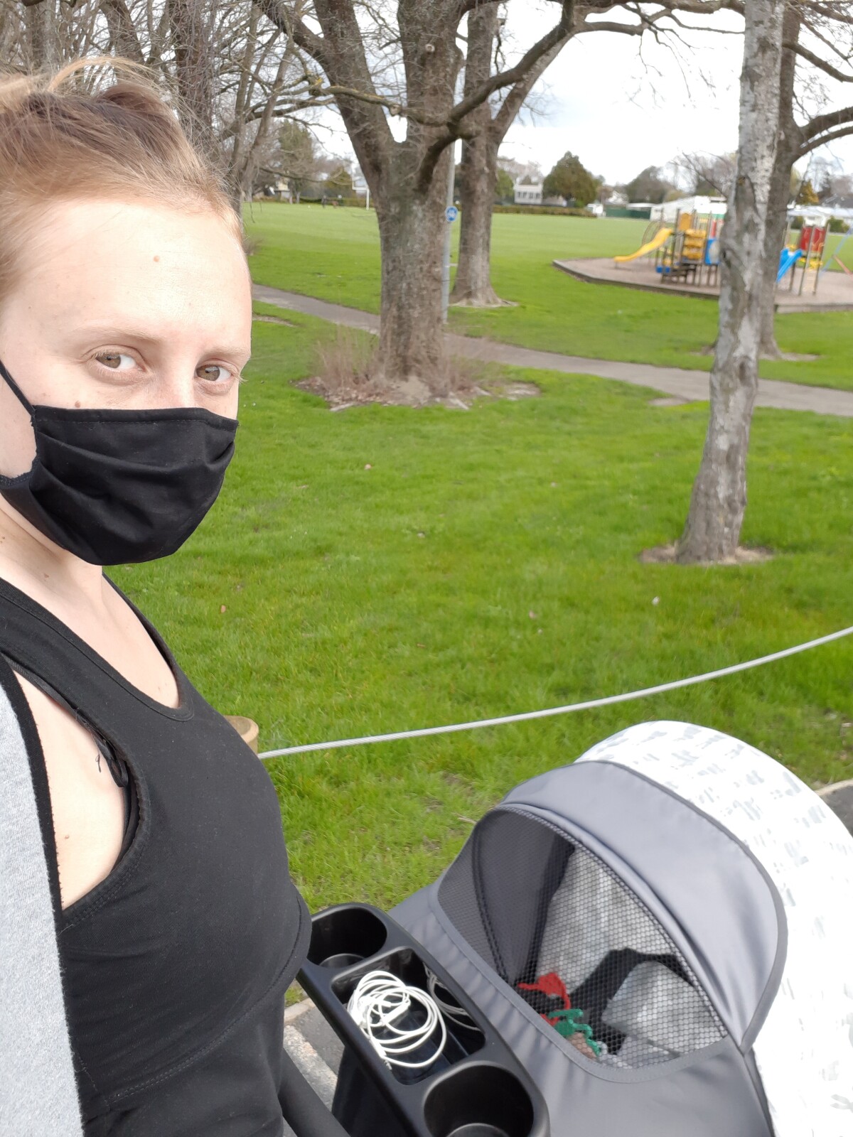 Out for my daily masked up, socially distanced walk with my napping 6 month old son during Covid-19 level 3 lockdown. Taken at the entrance to Spreydon Domain.