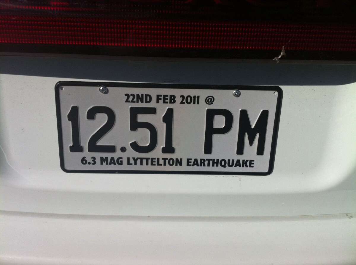 License plate commemorating the 22 February earthquake as seen in a shopping centre car park. License plate reads 22ND FEB 2011 @ / 12.51 PM / 6.3 MAG LYTTELTON EARTHQUAKE.
