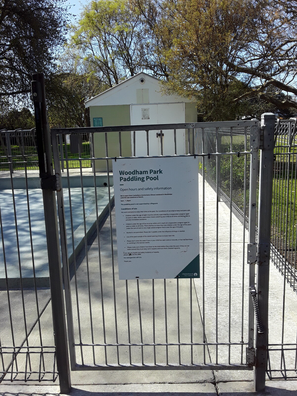View of gate enclosing Woodham Park paddling pool with council notice.
