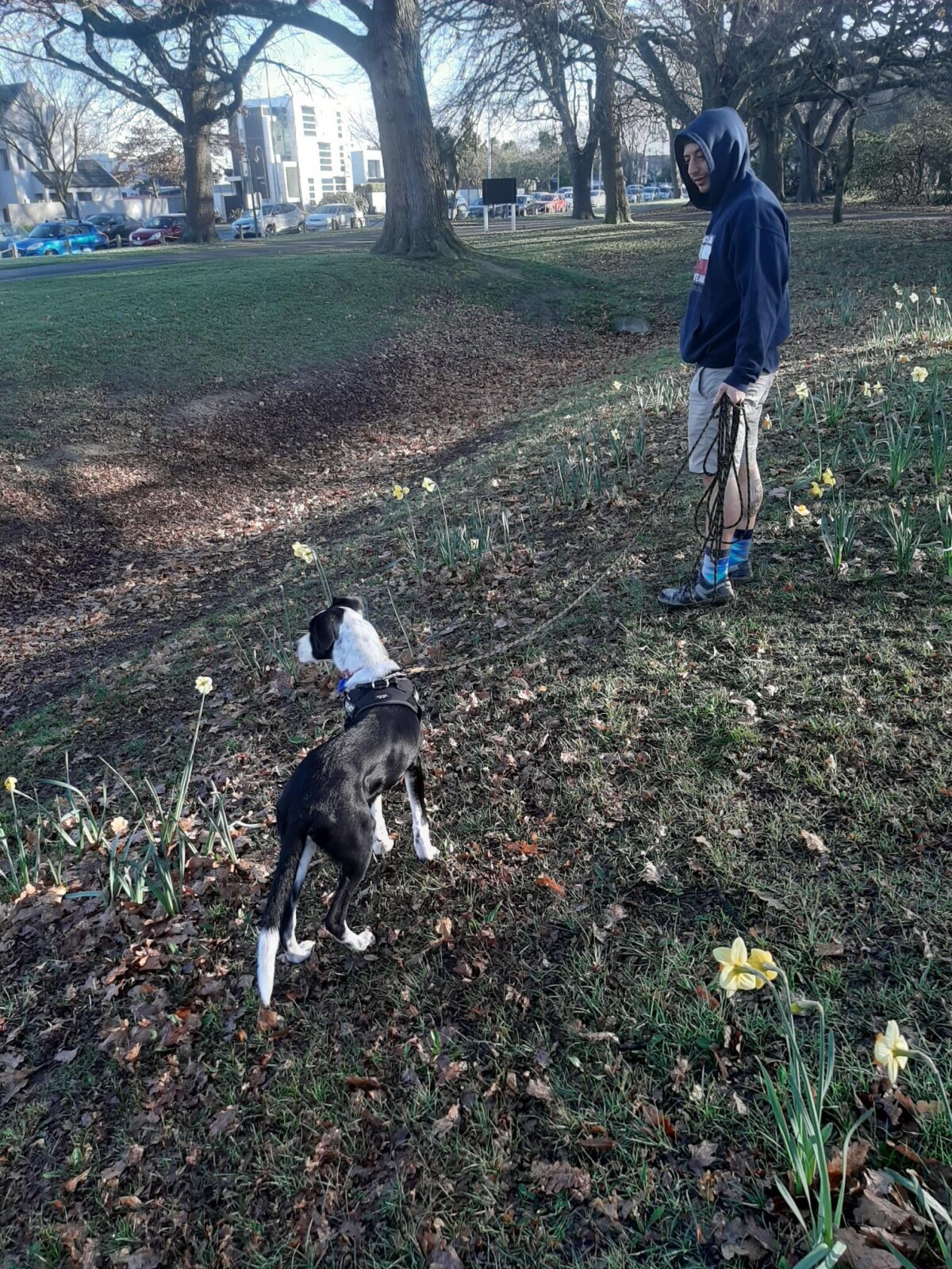 A man and his dog checking out the daffodils at Hagley Park.