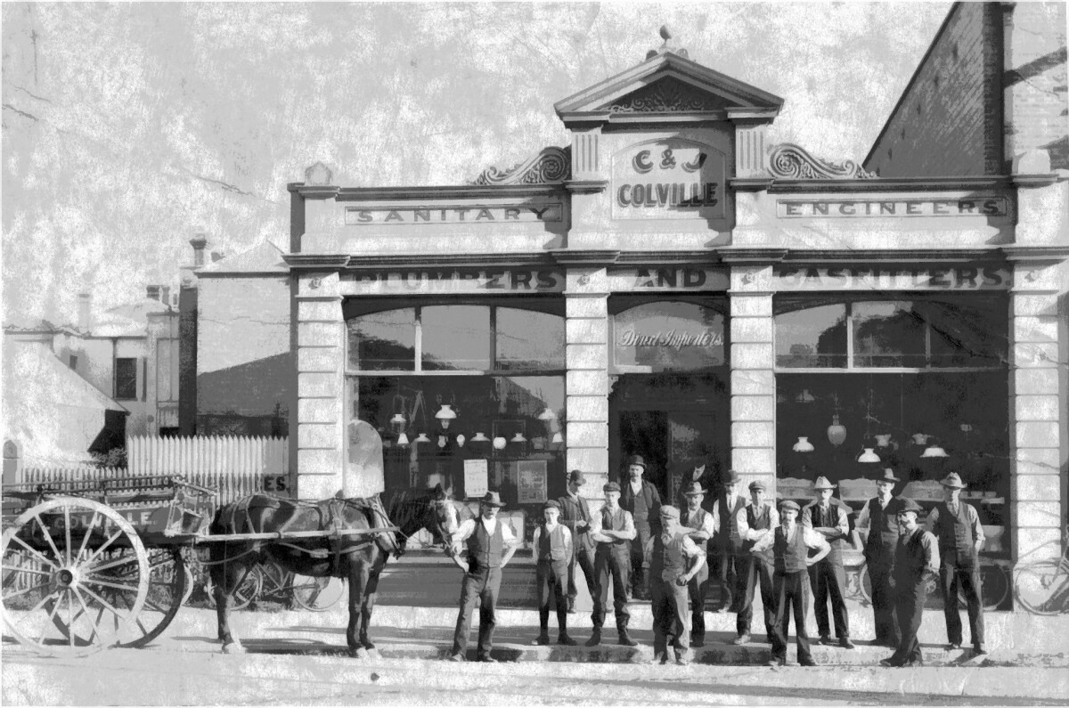 C & J Colville Plumbers and Drainlayers building and staff 28-30 Cathedral Square around 1905.