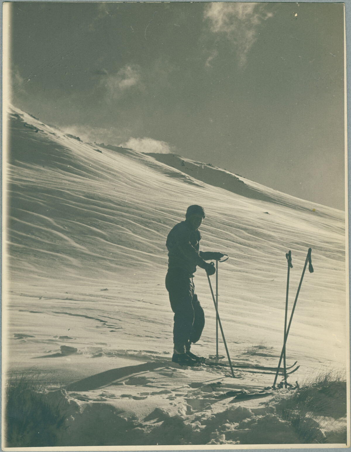Skier in the Top Hut Basin in the Craigieburn Range. Photo taken by Dr William Mummery Platts.