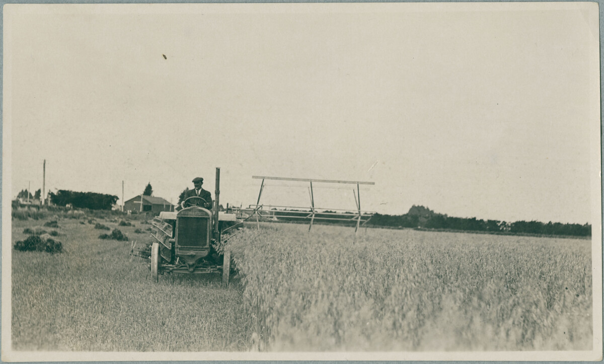 "Father with the first ‘binder’ in Dunsandel. Father is William Wraght and are on “Greensfield” Farm. This machine cut the grain and tied it. The grain was then stacked (grain in, stalks out) as winter feed for the animals)." -Contributors note.