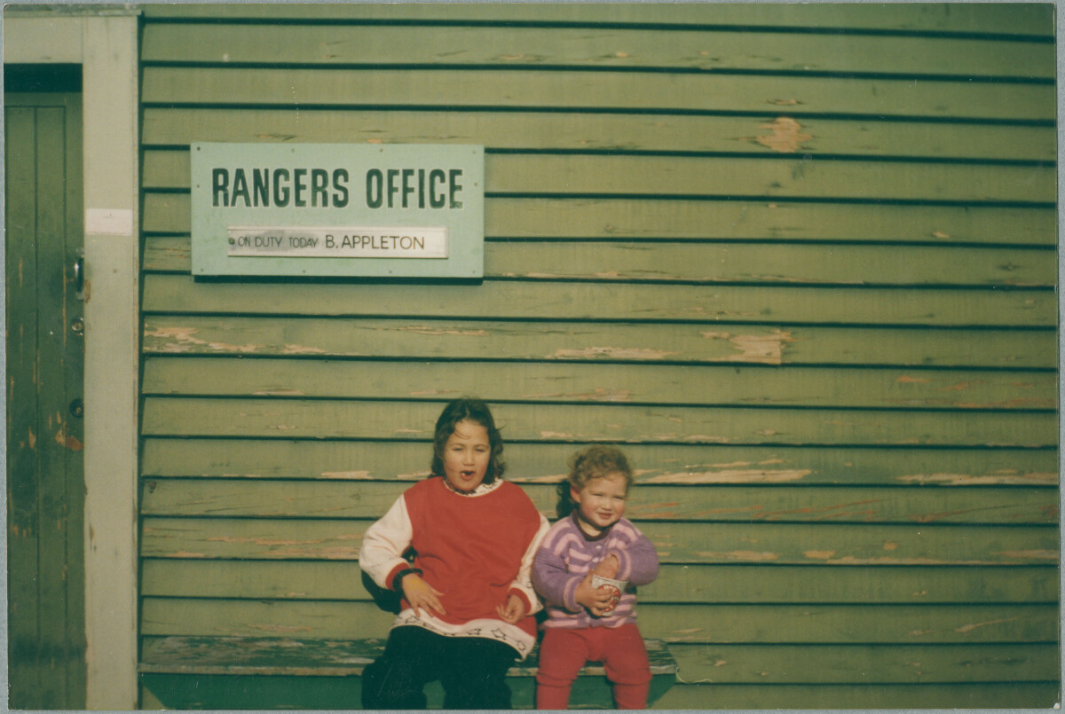 Ngapiu and her sister eating hot chips in front of the ranger office at the botanical gardens.