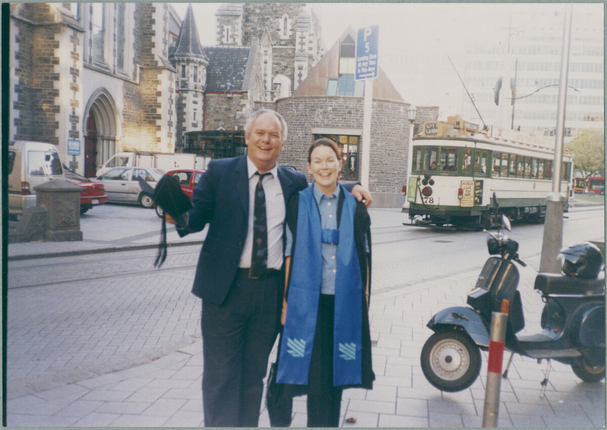 "After a drink at Bailie’s in the Square, celebrating my Bachelor’s Graduation with my Dad. An idyllic Christchurch day with the Cathedral and a tram in the background." - Contributors note.