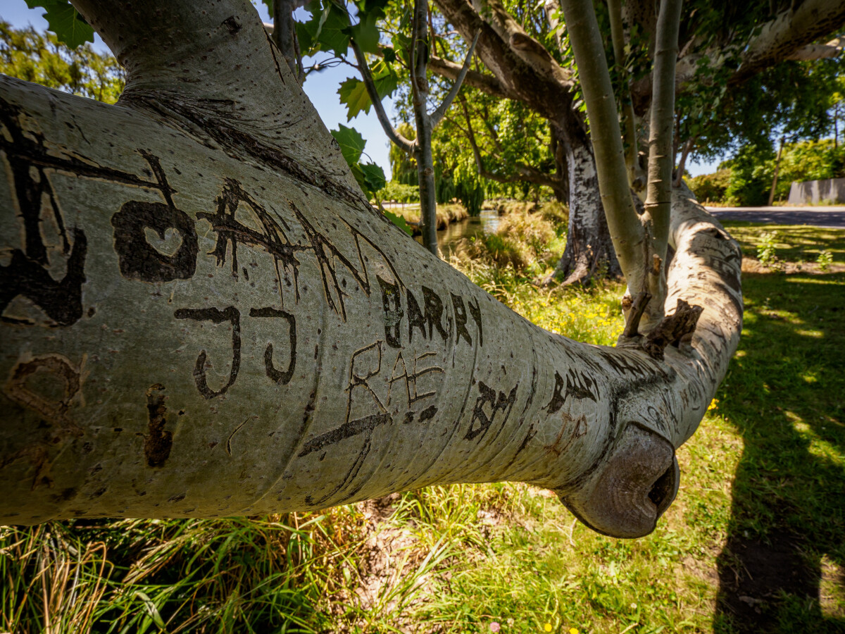 A tree with a long low branch covered in scratched names and messages on the Te Ara Ōtākaro Avon River Trail.