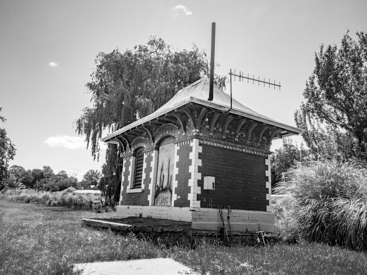 A building which is on a noticeable backwards lean towards the river behind, on the Te Ara Ōtākaro Avon River Trail.