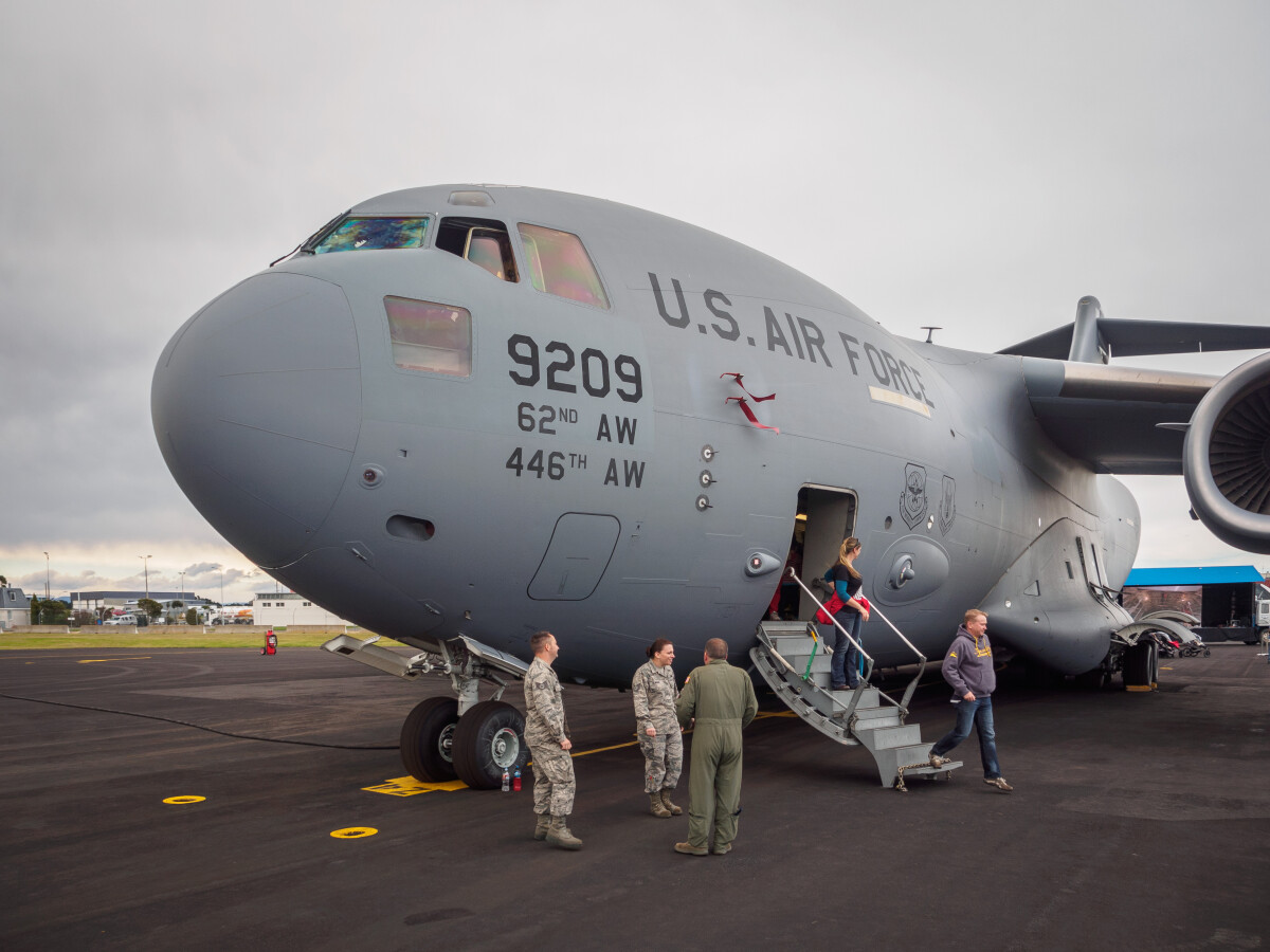 Uniformed USAF staff outside the C-17 Globemaster III at the United States Antarctic Programme Open Day at Christchurch Airport.