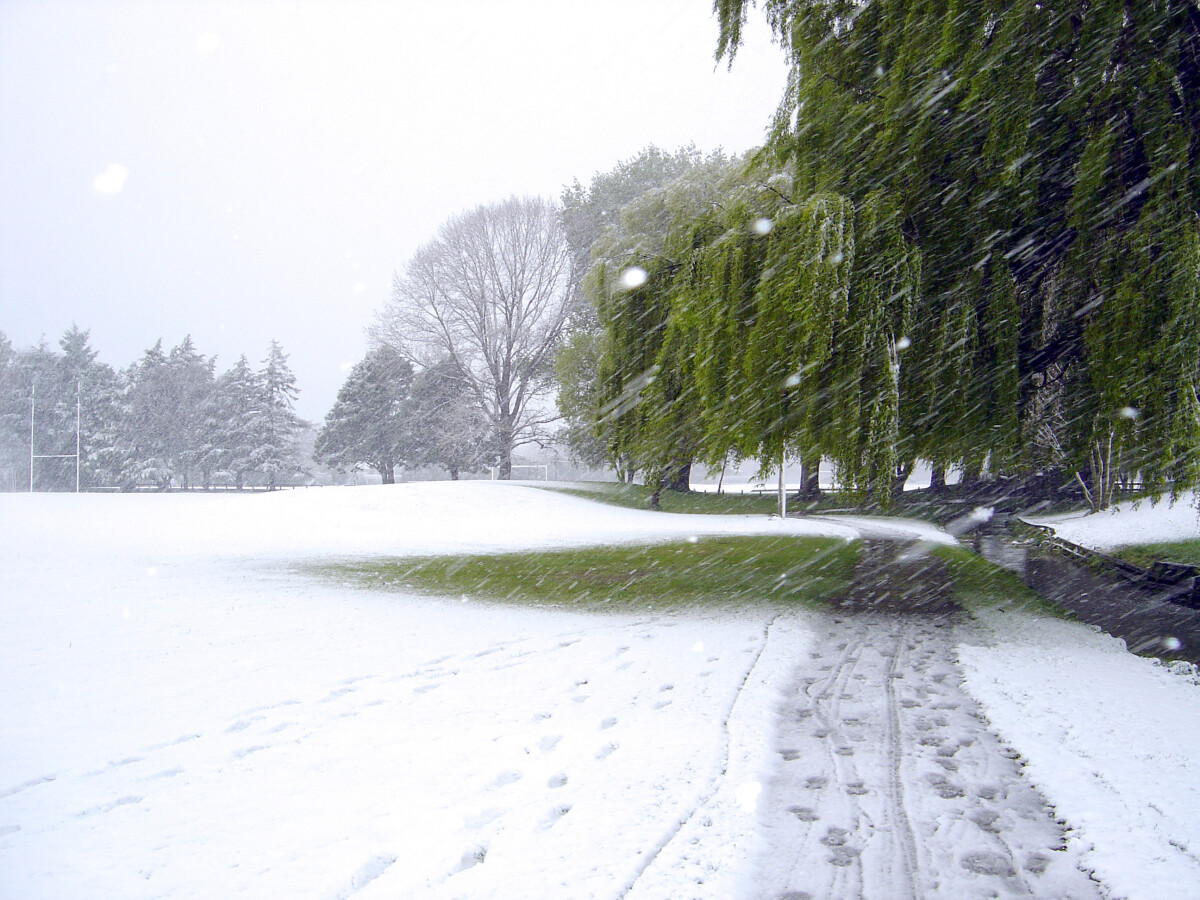 A rare snowstorm at the lower fields of Burnside High School.