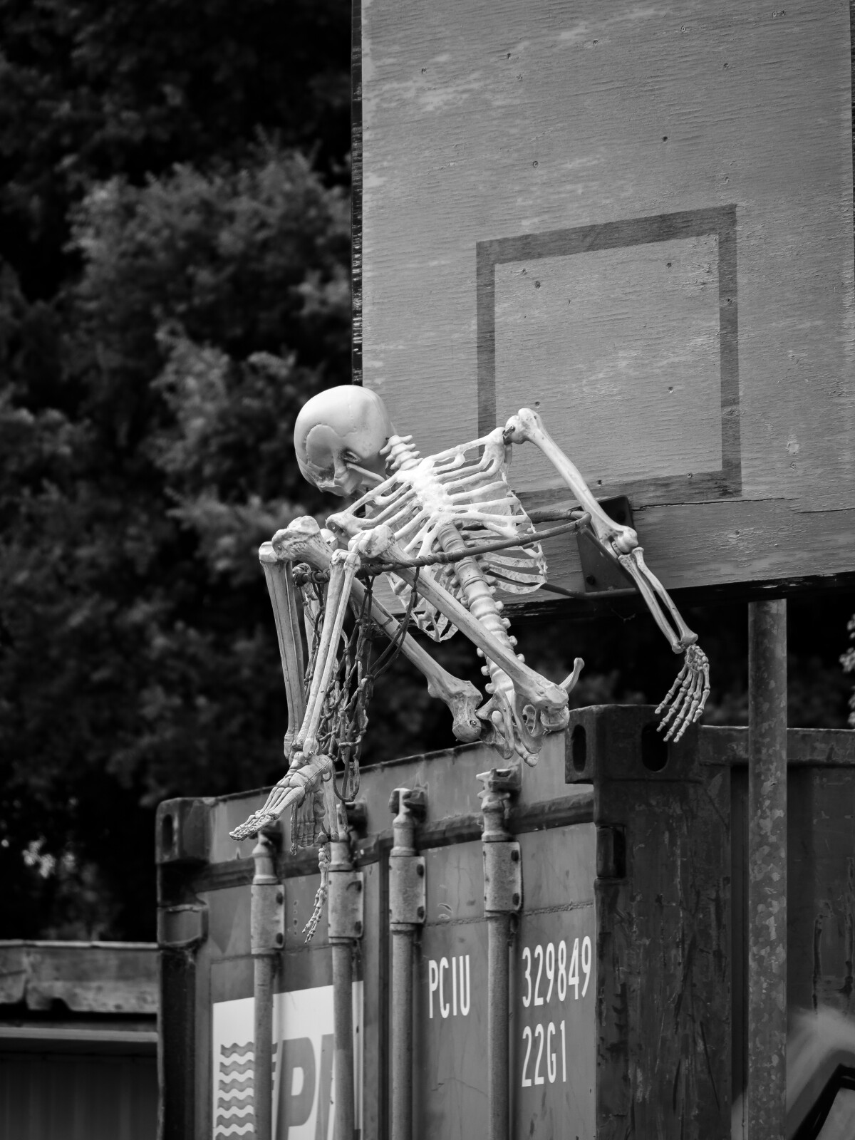A fake skeleton at the front of a property near Travis Wetland, just after coming out of the first lockdown of the COVID-19 pandemic.