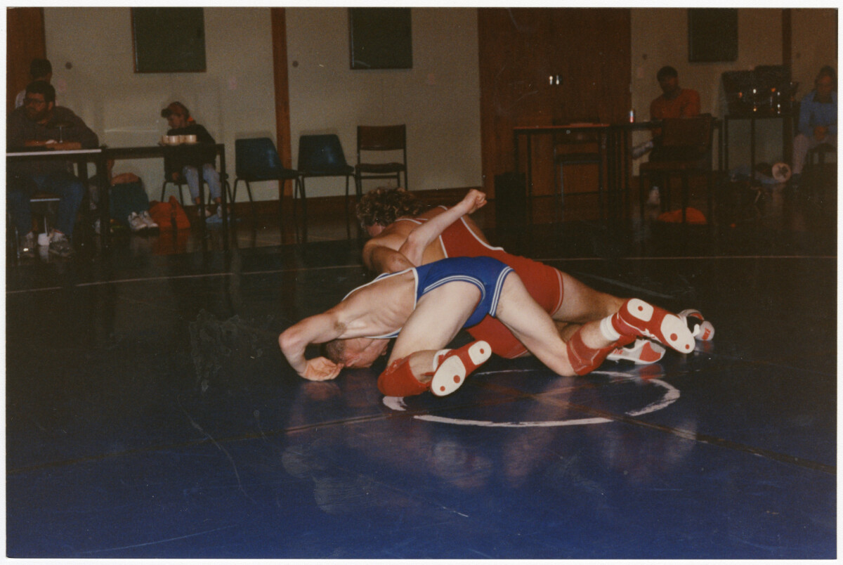 Action during a wresting match of Action of Jamie Haugh of Opawa (left) and John Tavendale of Rangiora in tackle during the Canterbury wrestling championships, 55kg category.