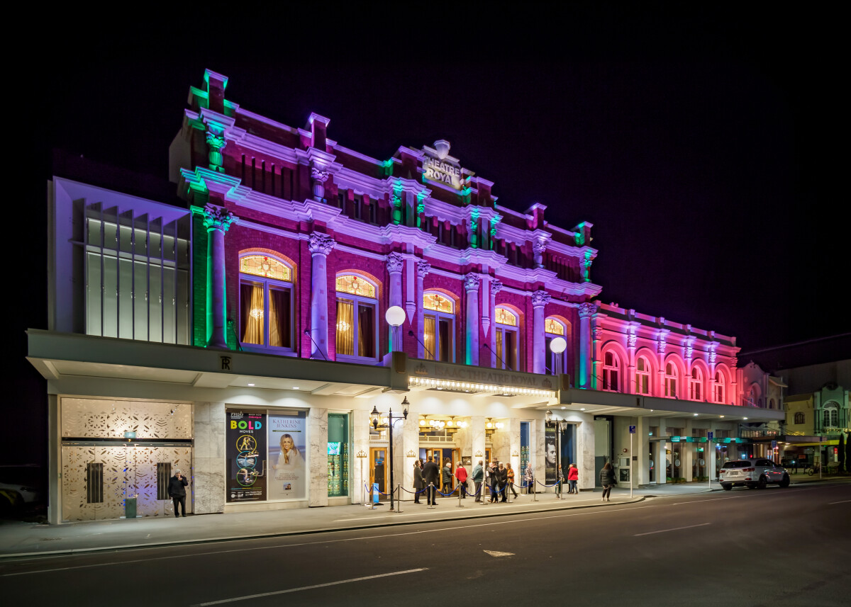 The outside of the theatre was lit up in splendid colour for the run of "Bold Moves".