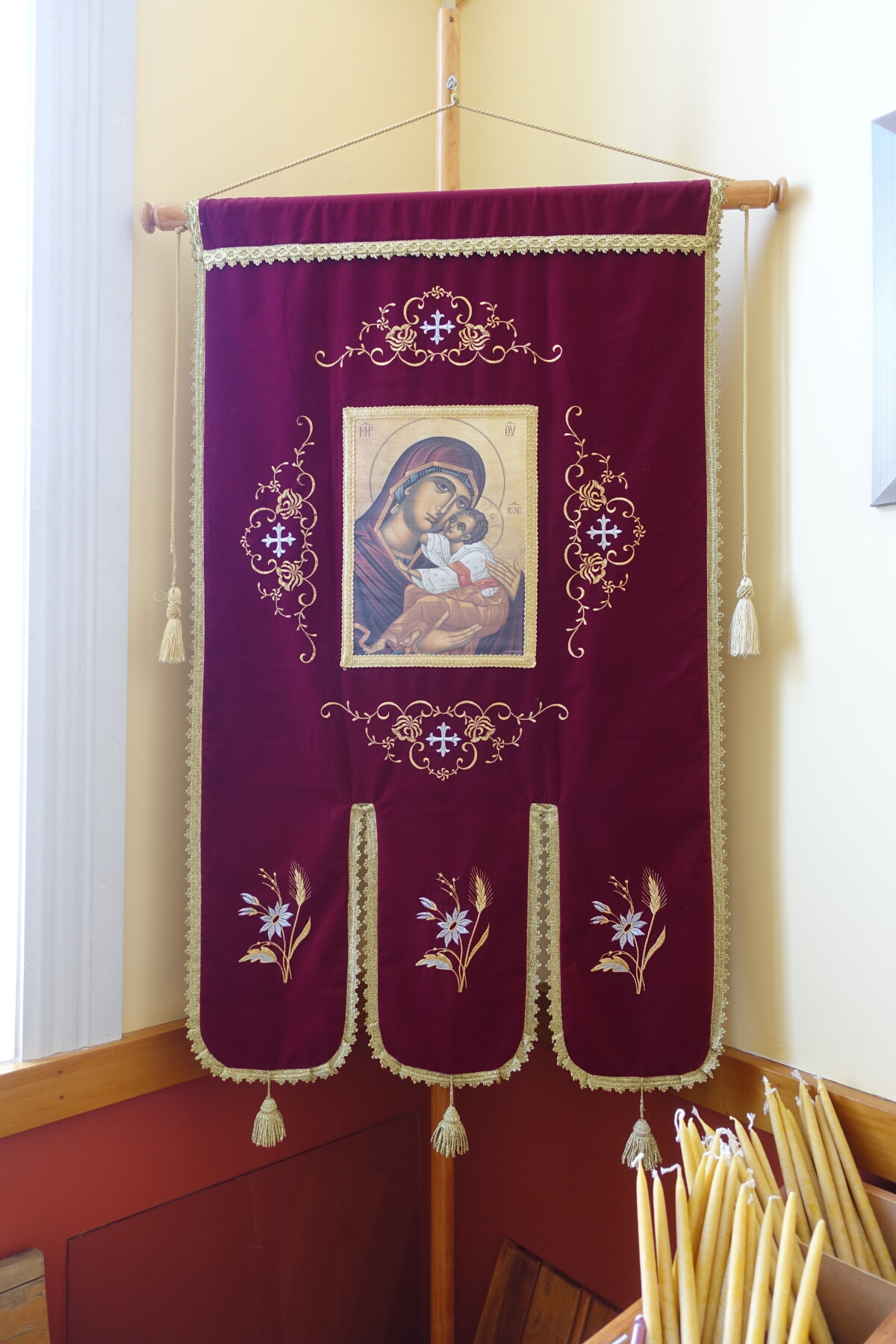 Velvet banner featuring and image of Mary and Jesus, Romanian Orthodox Church Dormition of Virgin Mary. Photo taken during Christchurch Heritage Festival Phillipstown Neighbourhood walk, 16 October 2021.