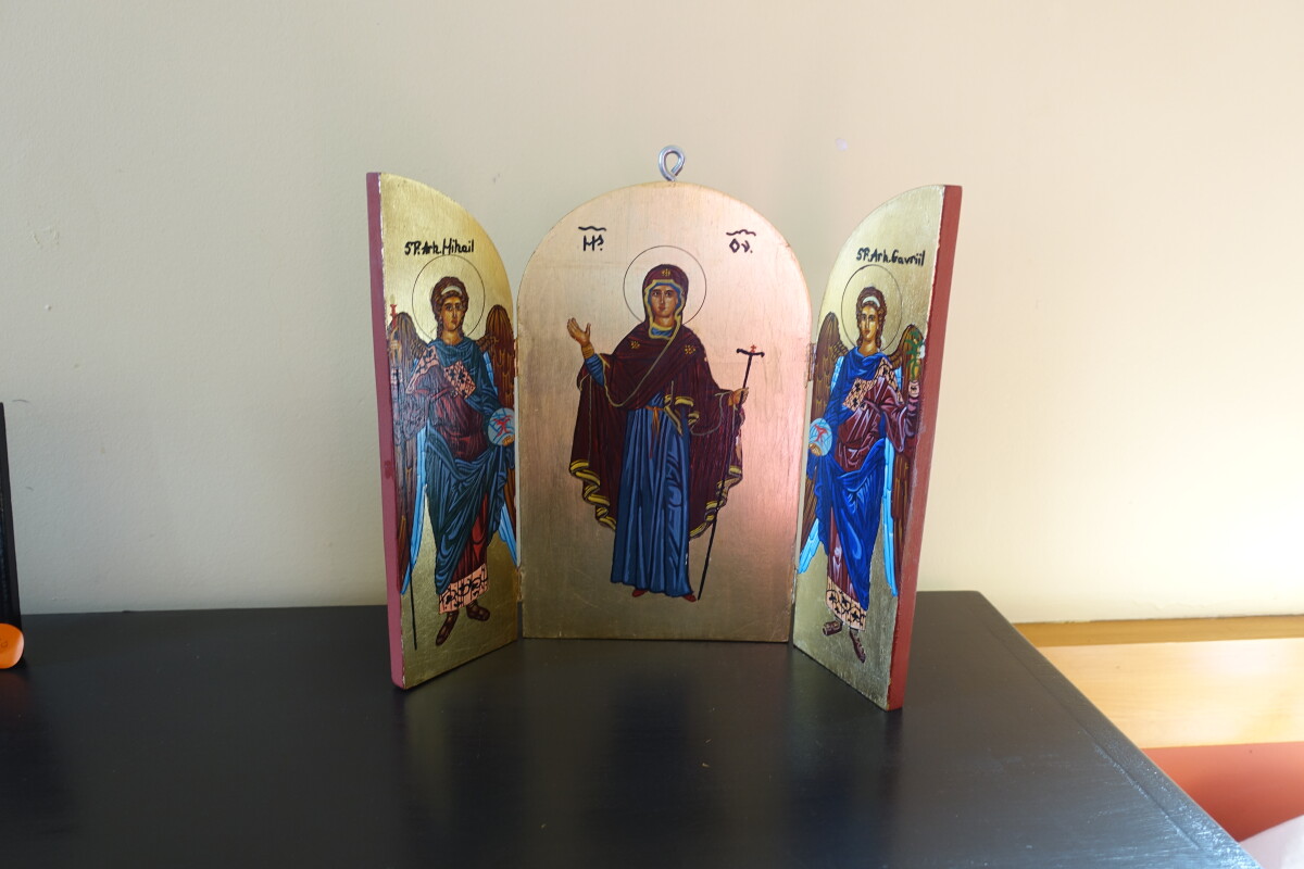 One of many religious icons for sale, Romanian Orthodox Church Dormition of Virgin Mary. Photo taken during Christchurch Heritage Festival Phillipstown Neighbourhood walk, 16 October 2021.