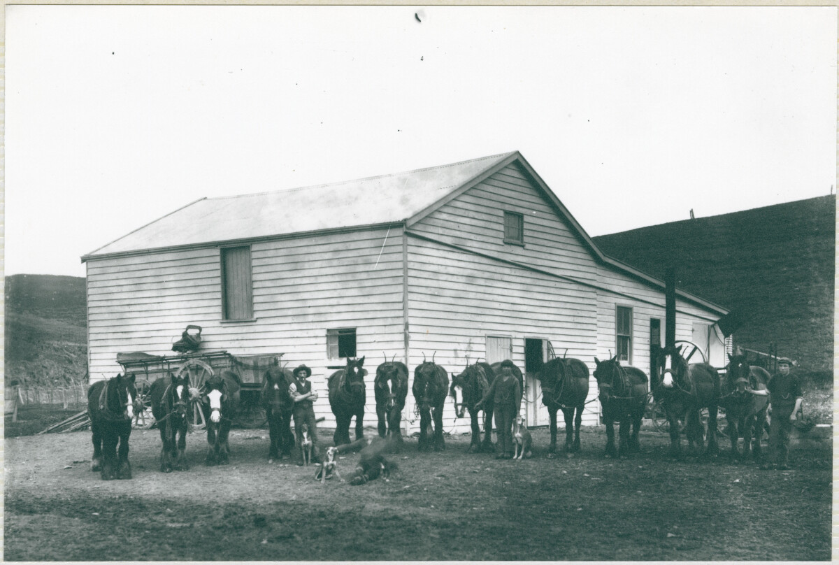 Con McKee, Joe McKee (sitting), Greg McKee and Barney McKee with 12 horses in front of stables 1910.