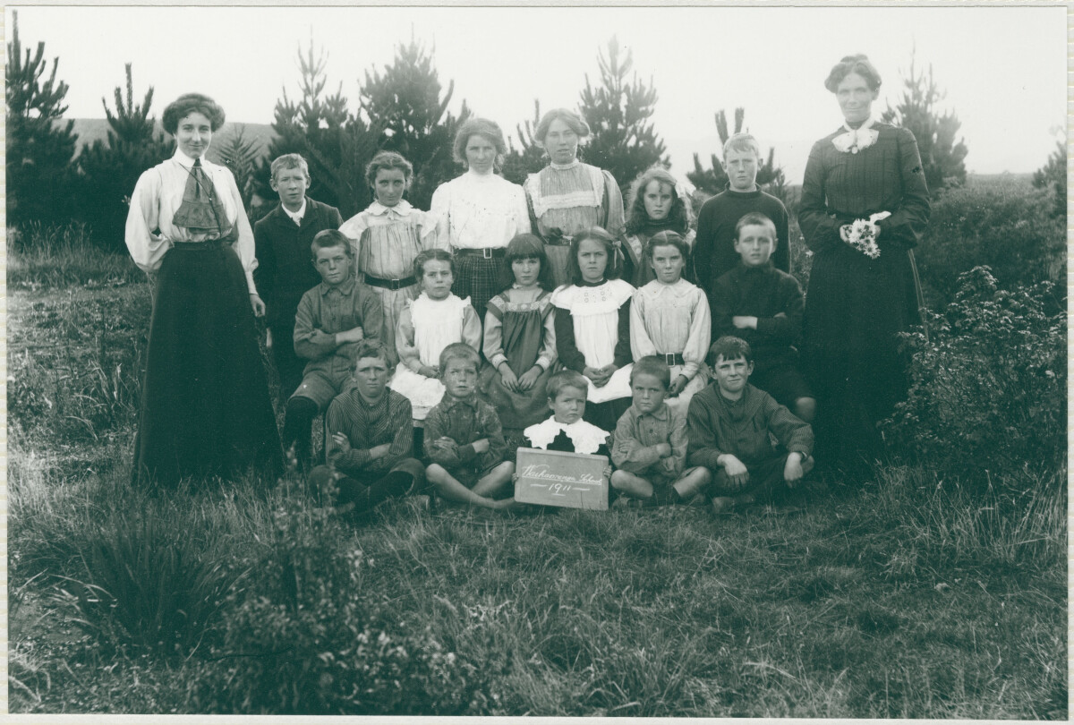 Waihaorunga School 1911. Known people: Ethel Elderton, Flors Powell, Mrs Knight, Ella Powell, Jessica Black, Bill Shrimpton (Takatu) and Bob Black.