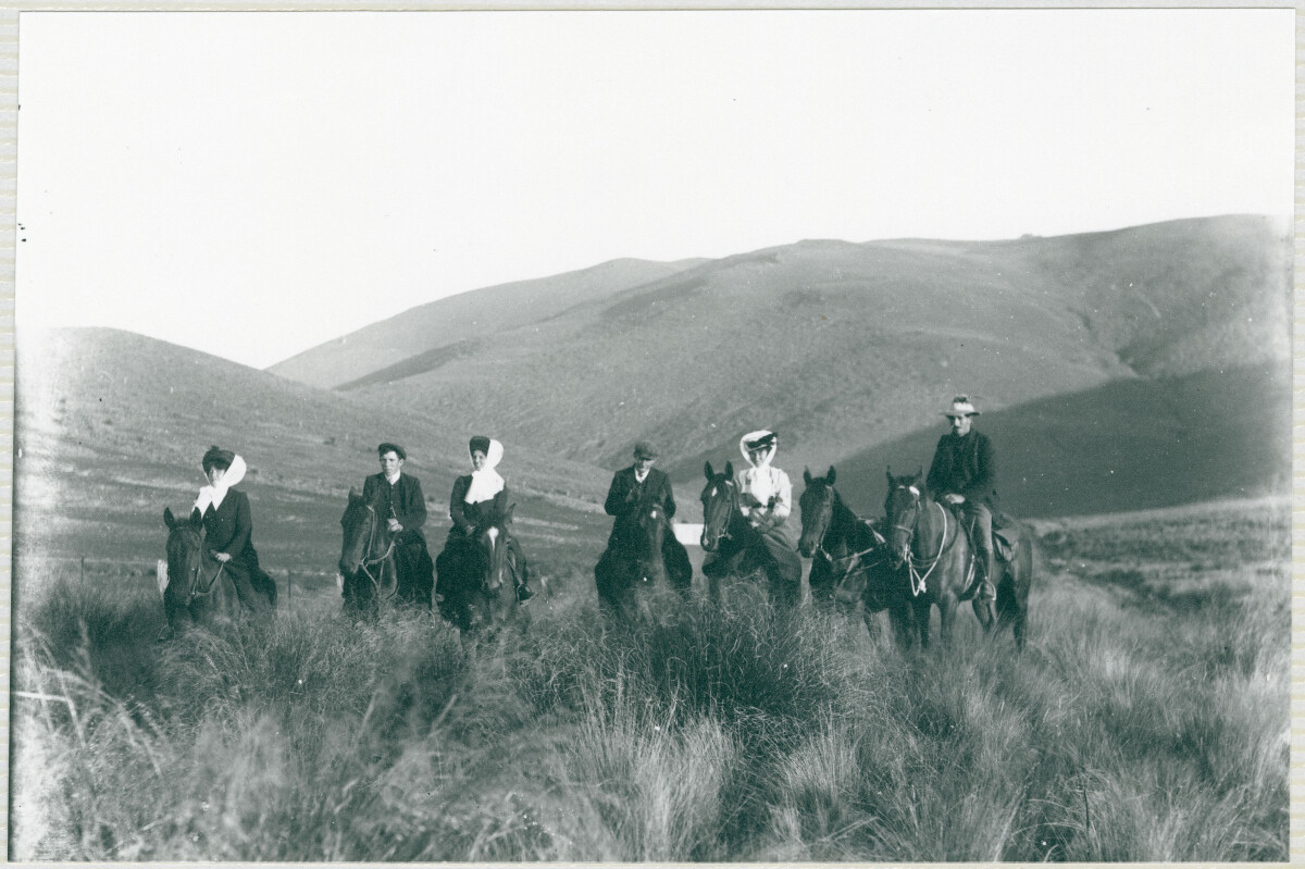 Greg McKee and Con McKee with three unidentified ladies on an outing to Meyers Pass 1914.