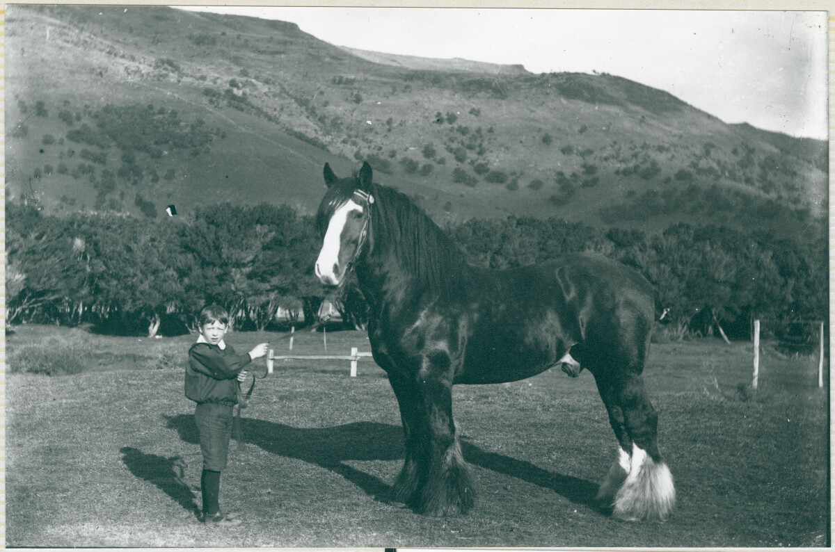 Young lad poses with a draught horse. Thought to be on Banks Peninsula. c.1905-1908.