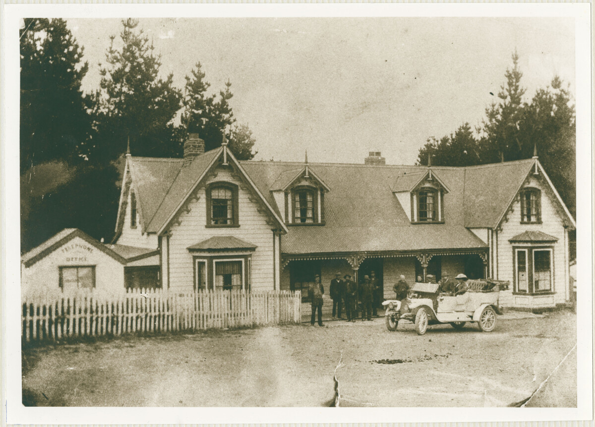 Group outside the Hilltop Hotel and post office in Akaroa.