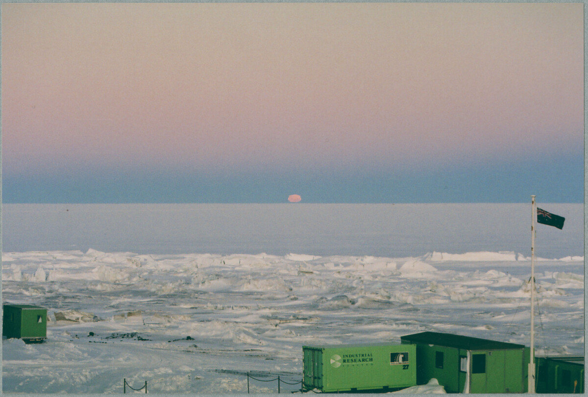 Moon setting over the horizon, Scott Base in Antarctica 2005.