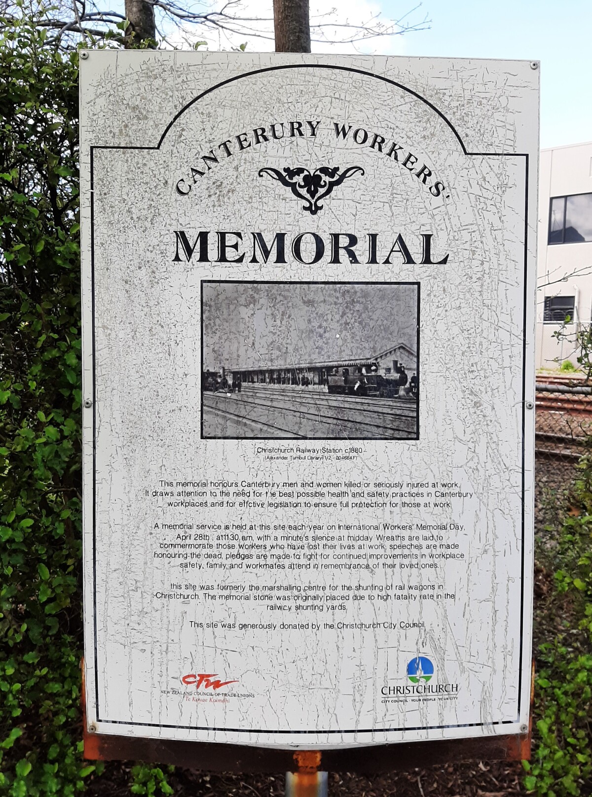 Canterbury Workers Memorial. At a small reserve on the site of the old Christchurch Railway Station (43°32'26.9"S 172°38'30.8"E)