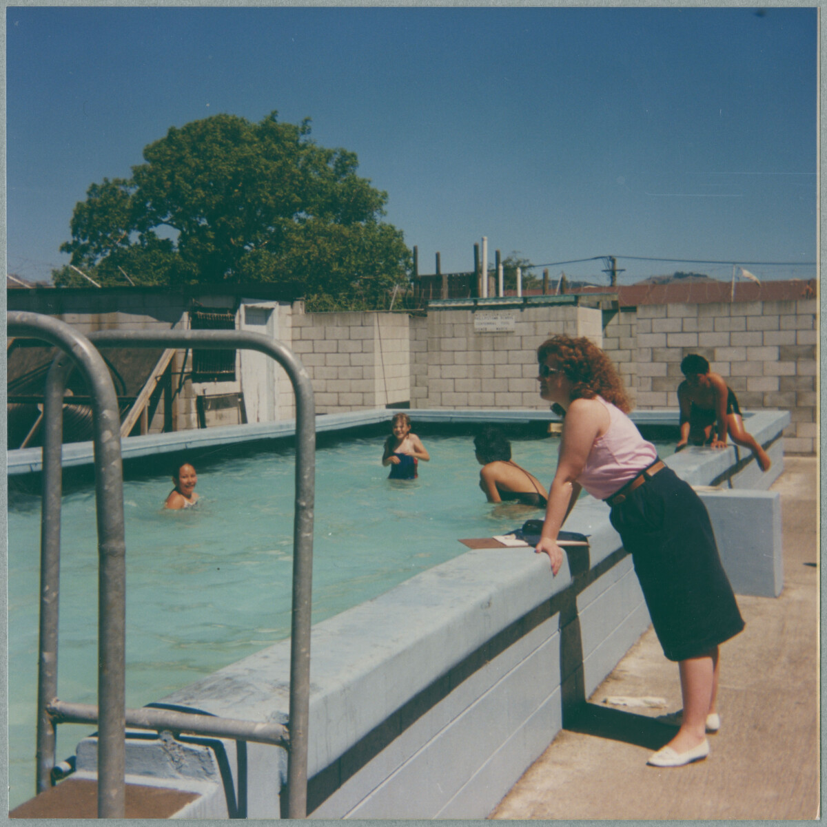 Children swimming at the Phillipstown Primary School pool while an adult (possibly a teacher) waits by the side.