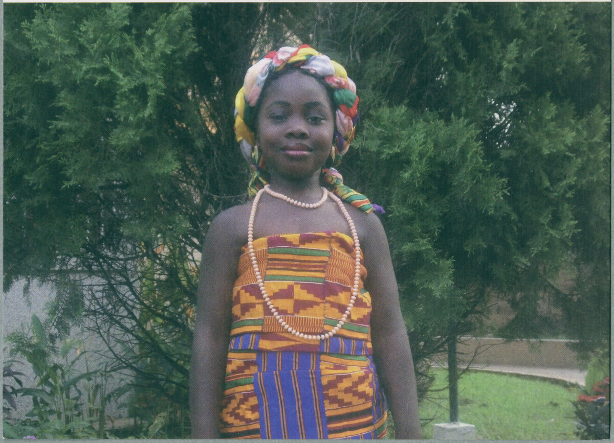 A young girl attending a family gathering at Accra in Ghana. She wearing colourful Kente cloth, displaying Ghanaian Heritage.