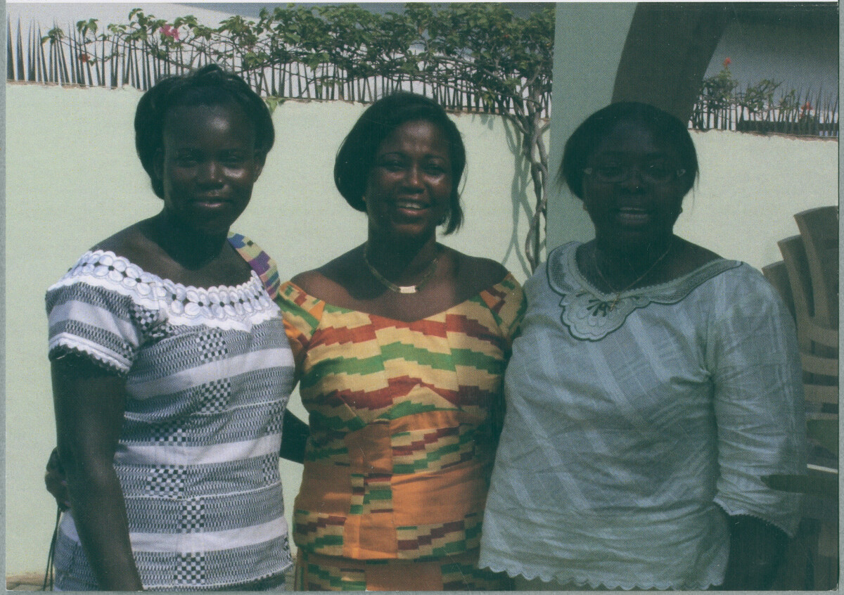Family members at a family gathering at Accra in Ghana. They are wearing colourful Kente cloth, displaying Ghanaian Heritage.
