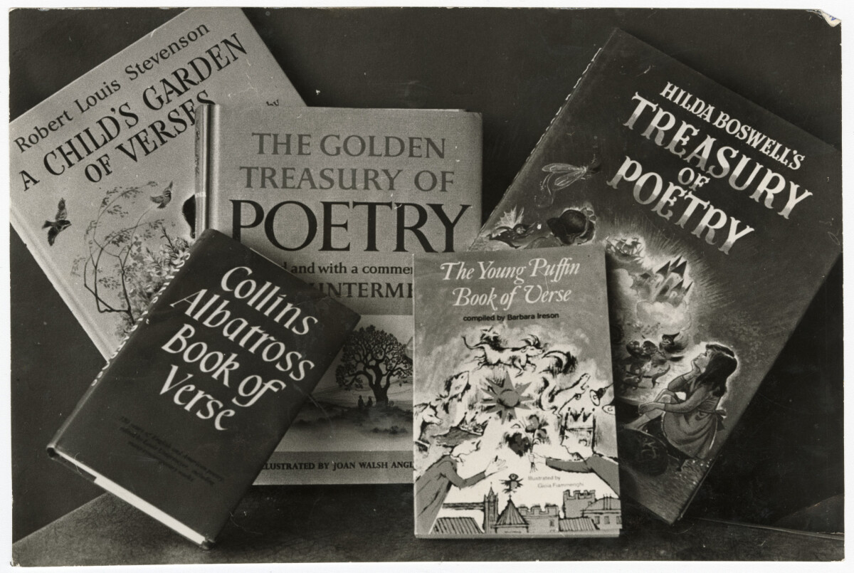 Close-up of poetry books donated by Collins Publishers as prizes for the Star Newspaper Starlets competition. Books, from left, A Child's Garden of Verses by Robert Louis Stevenson, Collins Albatross Book of Verse, The Golden Treasury of Poetry, Hilda Boswell's Treasury of Poetry and The Young Puffin Book of Verse compiled by Barbara Ireson.