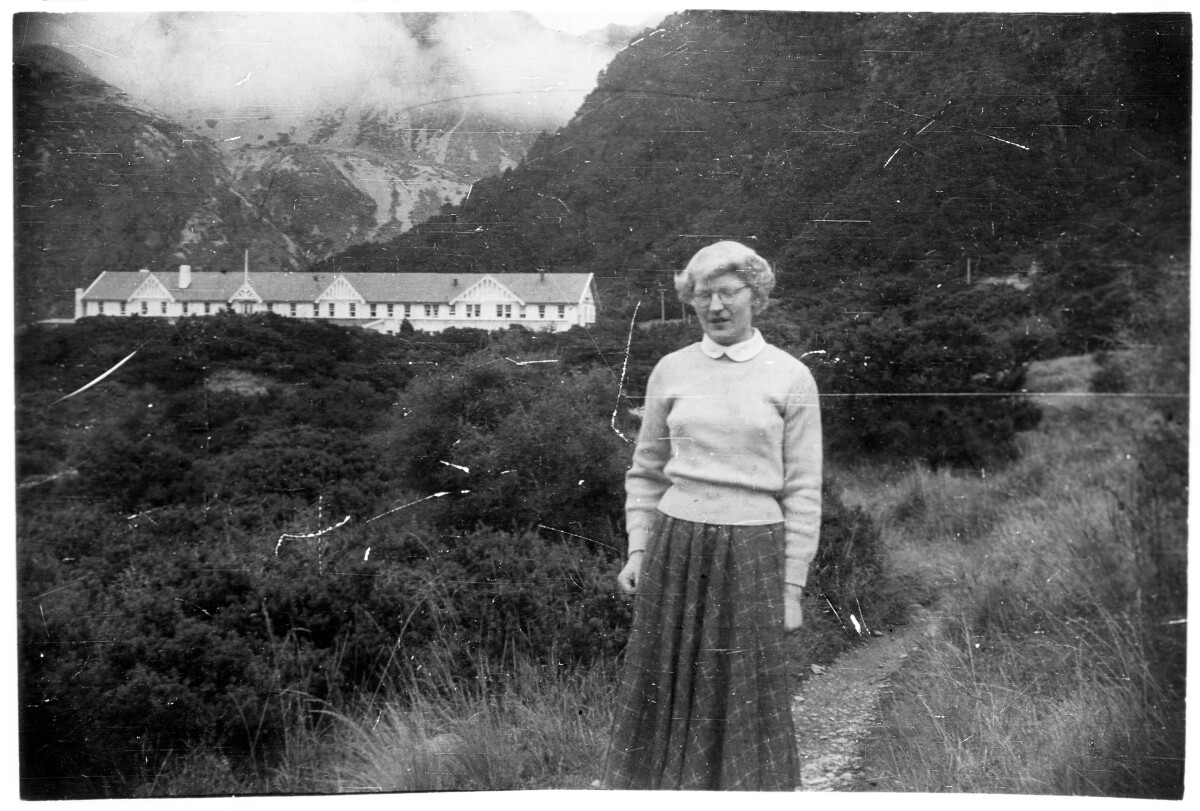 Elizabeth Abernethy (née Pearson) standing on a hill and the Hermitage Hotel, Mount Cook is in the background. This is where John Abnernethy and Elizabeth Abernethy went for their Honeymoon.