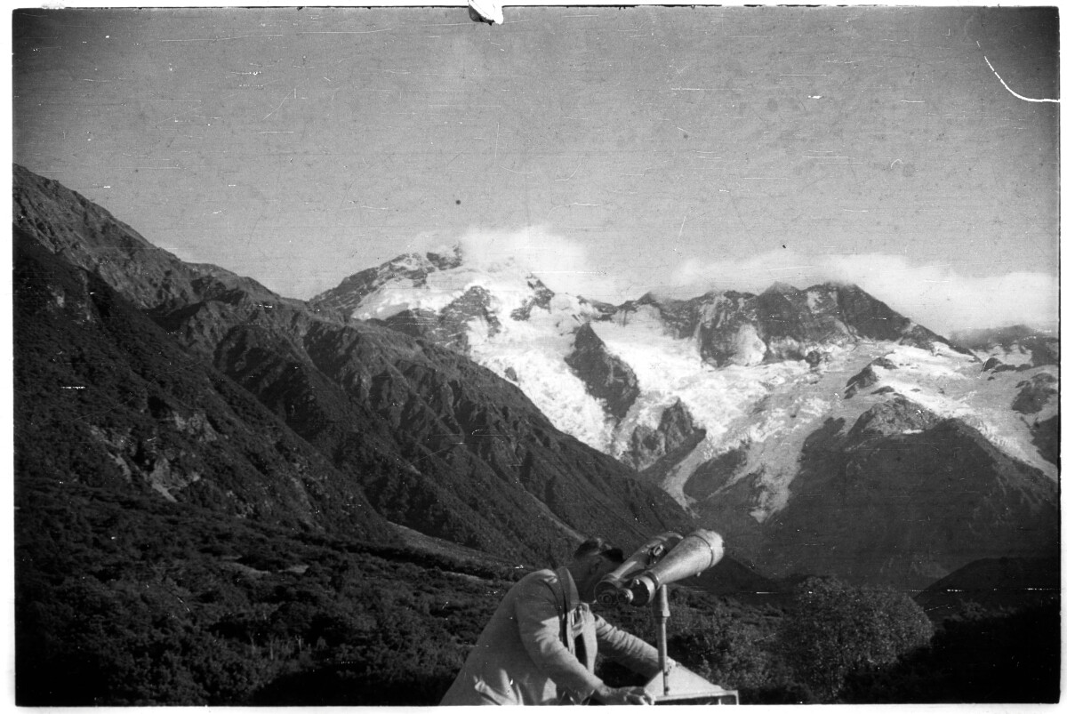 John Abernethy trying to set up binoculars to have a look at Mount Cook/Aoraki.