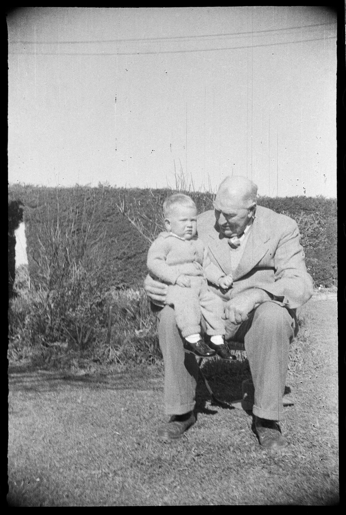 A baby is sitting on the knee of an elderly man.