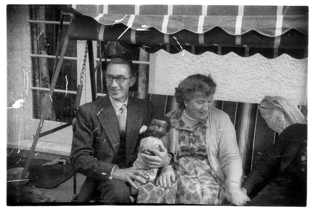 A man and a woman sitting on a swing outdoor chair with a canopy. The man is holding a doll.