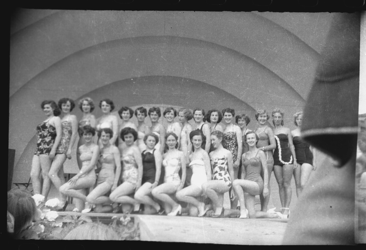 Women standing on the Caroline Bay Sound Shell in Timaru. They are all wearing swimwear.