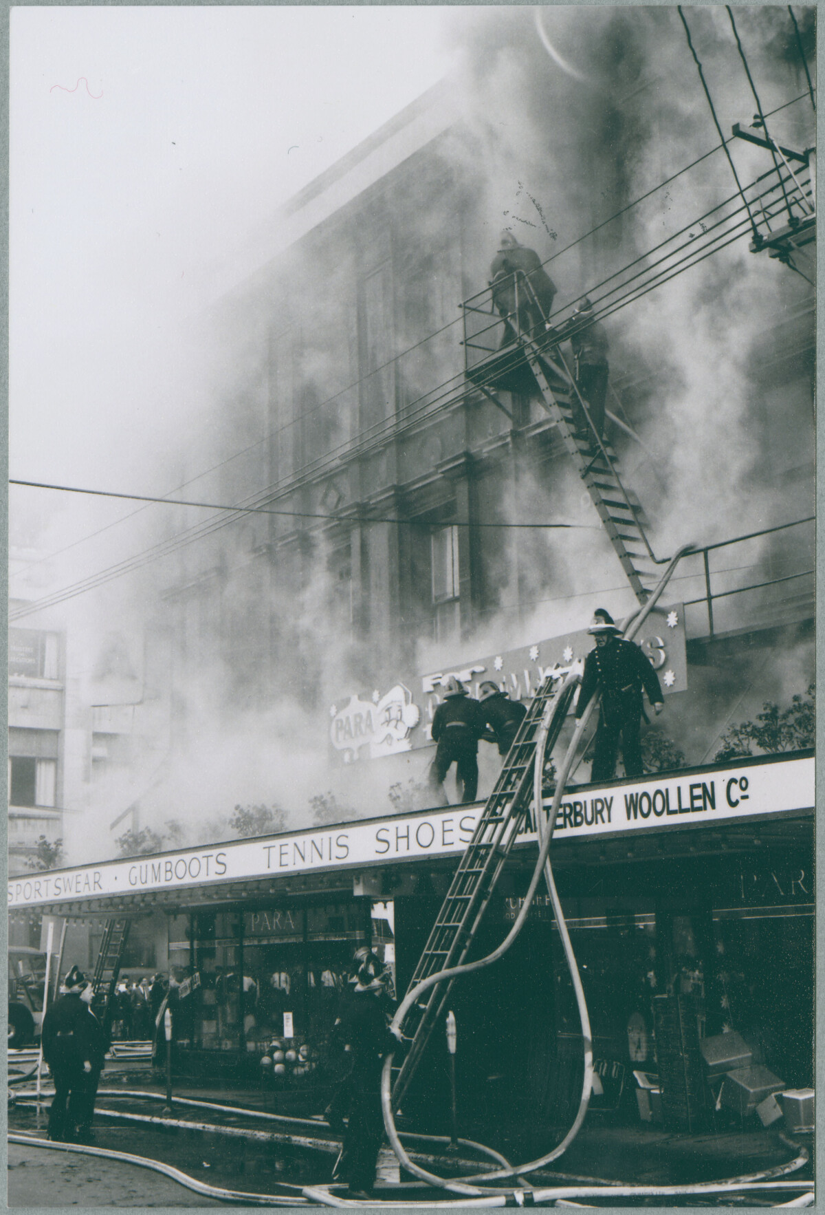 Horizontal view of the firefighters standing atop verandas and existing fire escapes with fire hoses, whilst smoke billows from the upper floors of the building. Power lines run alongside and towards the building. In the left of the photo there appears to be a number of spectators watching from the roof top of a building close by. This photo shows more of a ladder running from ground floor and firefighters handling of the hoses, communication between firefighters on the ground and veranda. Boxes flowing out of the store front door.