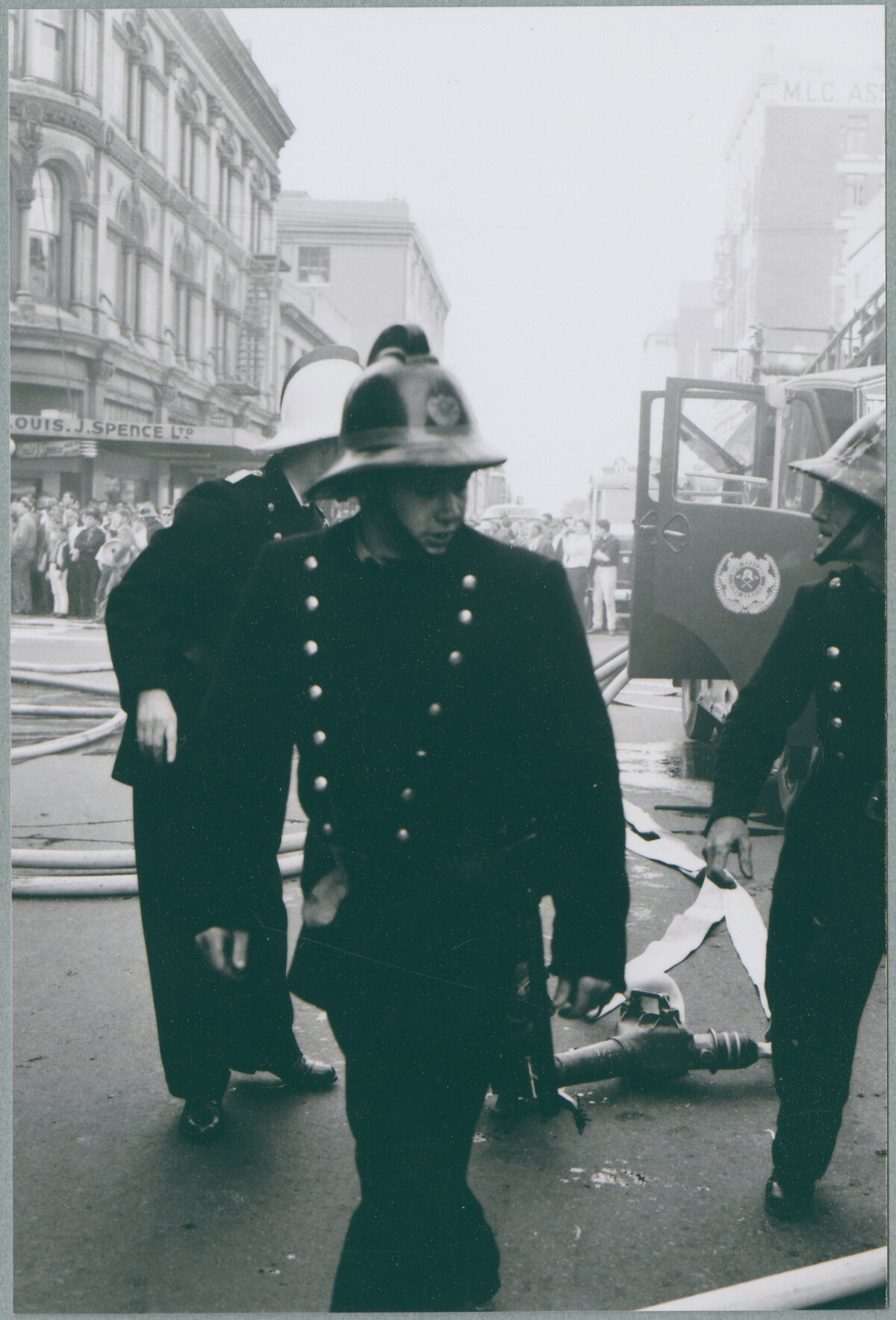 Interesting middle of street scene, background of other building along the street and on the corners of Cashel and Manchester Streets, watching crowds, background greyed out amongst the smoke contrasted in the foreground by the brighter dark colours of the firefighters and the open doors of engine, the fire insignia evident on an open door. A couple of flat hoses are not yet charged (filled with water), firefighters are likely to be setting these up. Different colours of helmets evident indicate different ranks, the white helmet may indicate seniority.