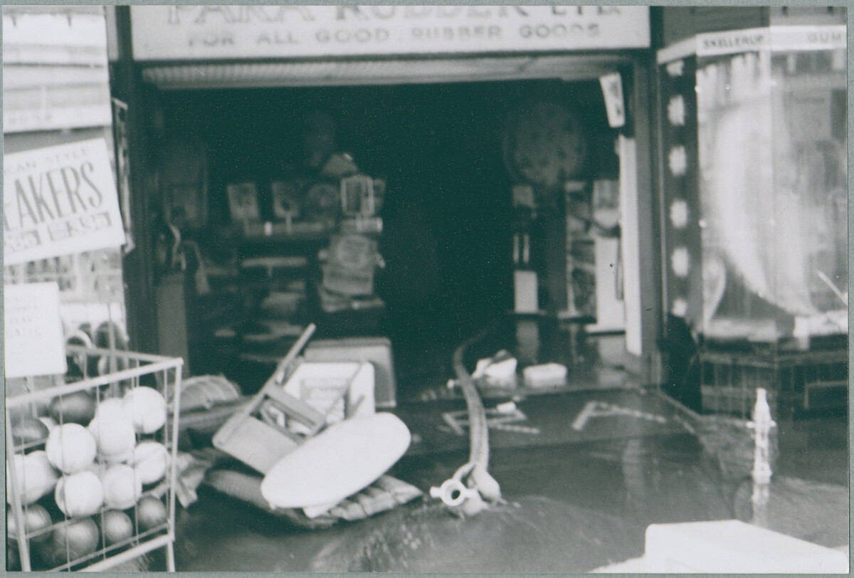 View of shop frontage, a different one than in photos 7 and 8 with different signage in these windows, bin of basketballs outside the door, dislodged goods spilling out over a Para mat in the entrance. My son, Simon, a volunteer firefighter mentions that to the right of the photo, there is a branch nozzle is sitting on it’s male connection end, in the centre of photo is a disconnected hose showing the female attachment end of the hose, the hose appears to be doubled over/knotted.