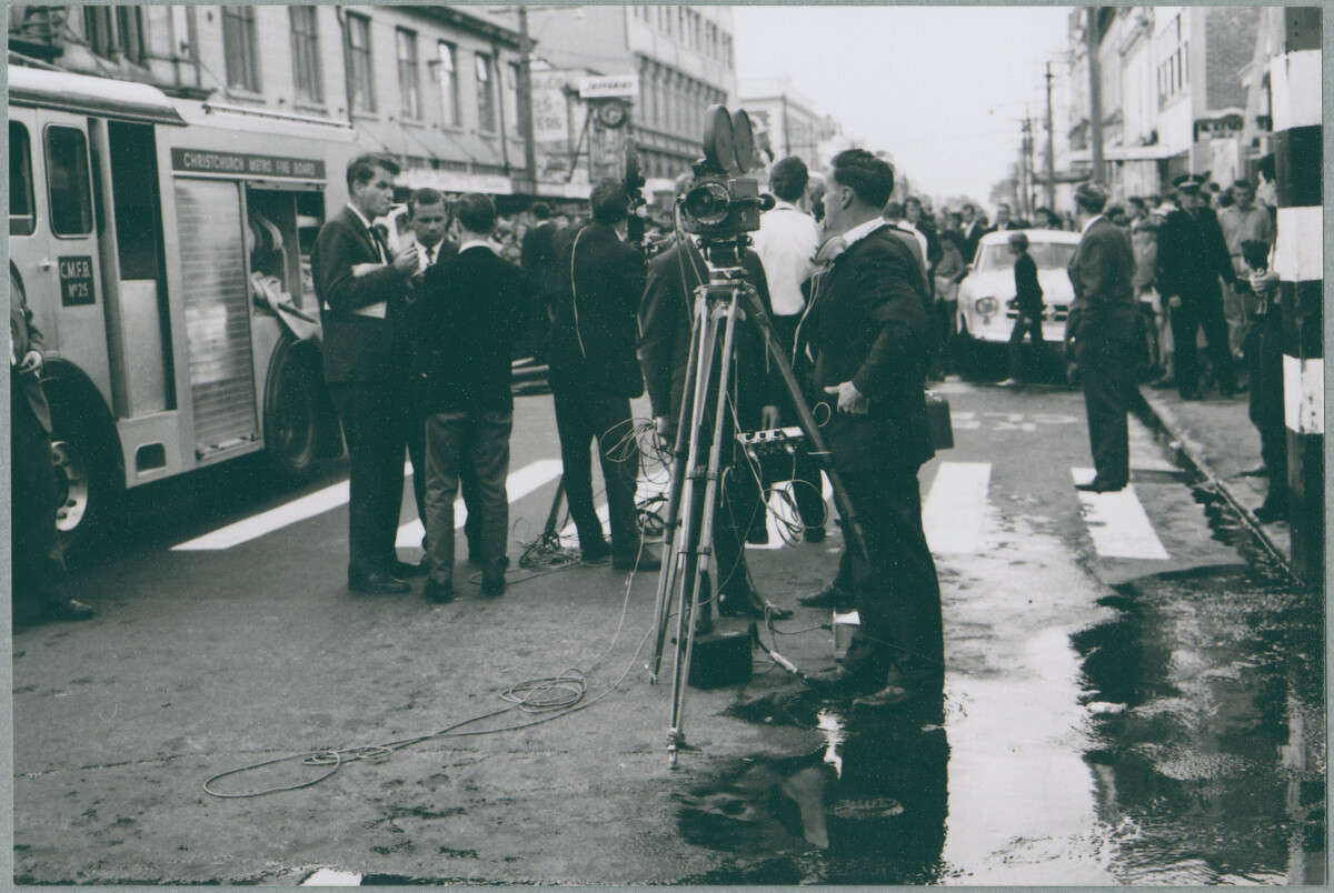 Street scene after the fire appears to have brought under control. The crowds are visible in the background while photographers and reporters are in the middle of the wet street near the fire trucks.