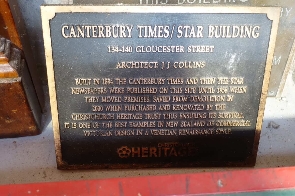 Christchurch heritage plaque which reads: Canterbury Times/Star Building 134-140 Gloucester Street Architect: J J Collins Built in 1884 The Canterbury Times and then The Star newspapers were published on this site until 1958 when they moved premises. Saved from demolition in 2000 when purchased and renovated by the Christchurch Heritage Trust thus ensuring its survival. It is one of the best examples of commercial Victorian design in a Venetian Renaissance style. Photo taken during Christchurch Heritage Festival neighbourhood walk.