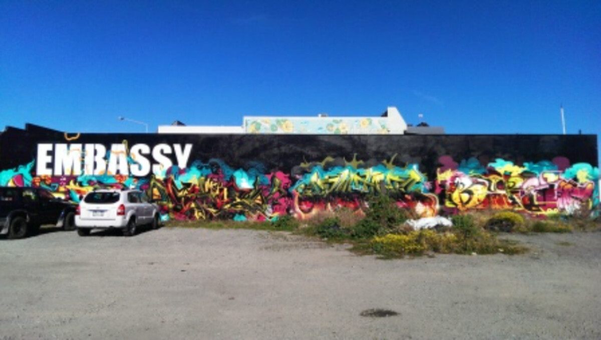 Mural by members of the TMD (The Most Dedicated) artist crew Berst, Phat1 and Vans the Omega on the side of Embassy clothing at 451 Colombo Street in Sydenham.