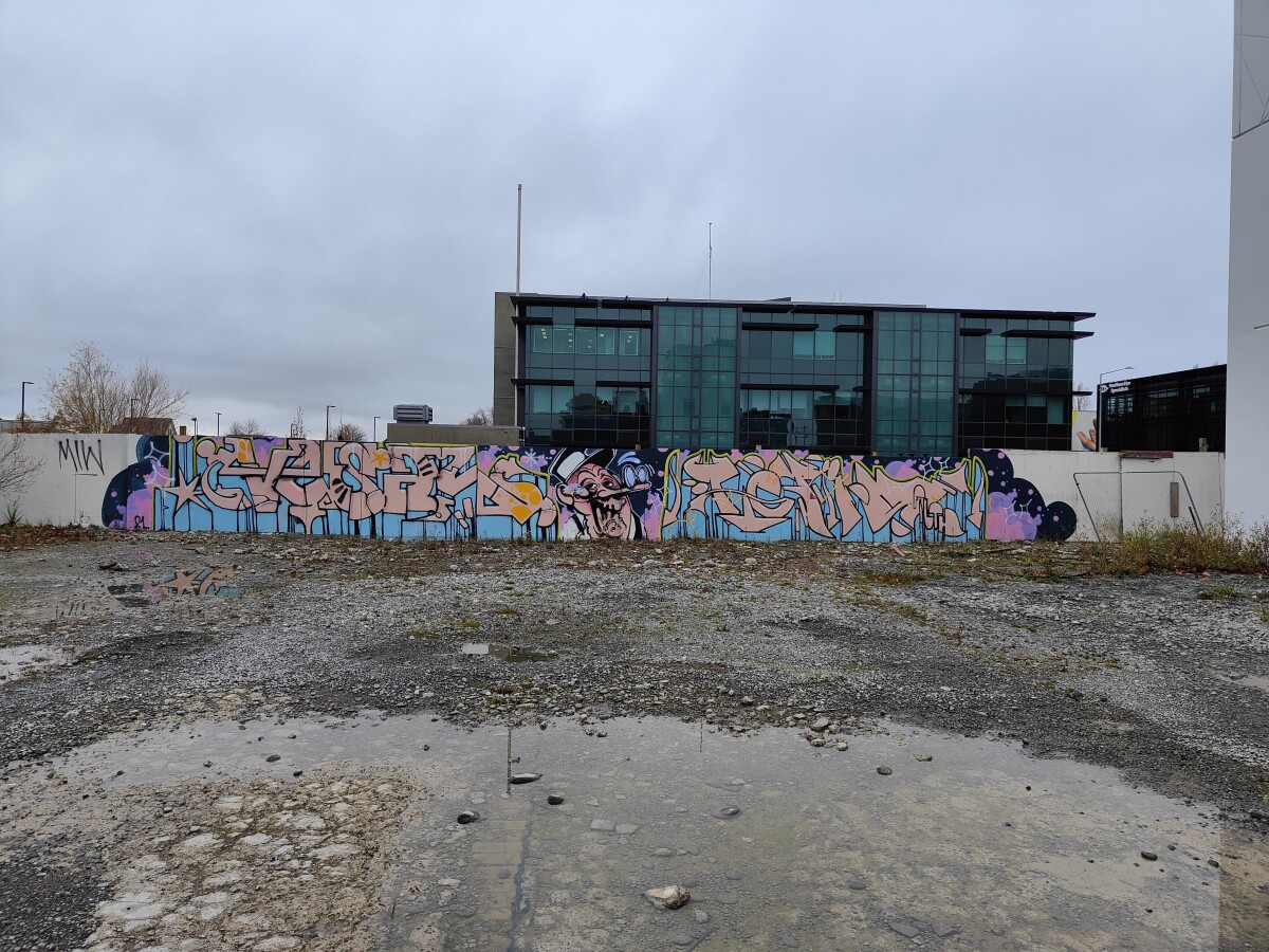 A mural created collaboratively between local Christchurch artists Vesil and Tepid on the wall of 812 Colombo Street. In the background is Forte Health Hospital at 132 Peterborough Street.